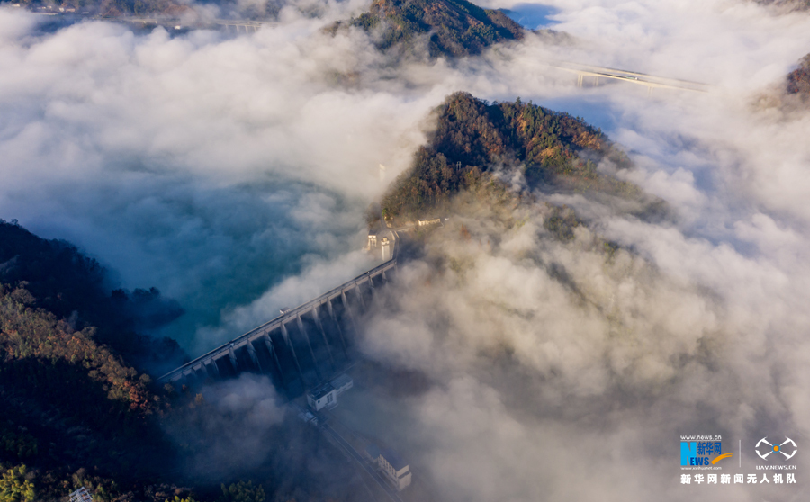 2月6日,安徽省六安市霍山县磨子潭镇。云雾下的磨子潭水库大坝(无人机照片)。新华网发(徐程 摄)