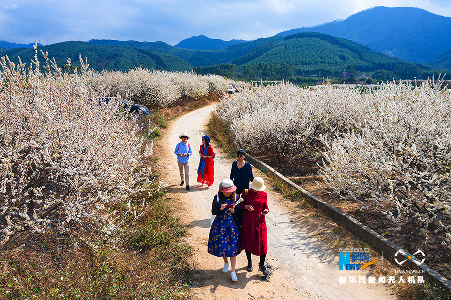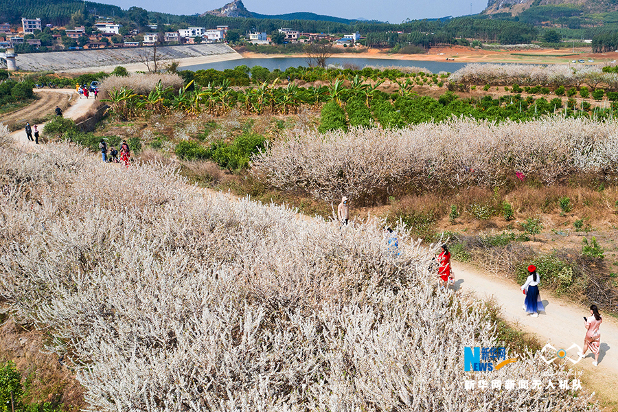 游人漫步在武鸣太平镇林渌村盛开的李花丛中。新华网发 梁挺摄