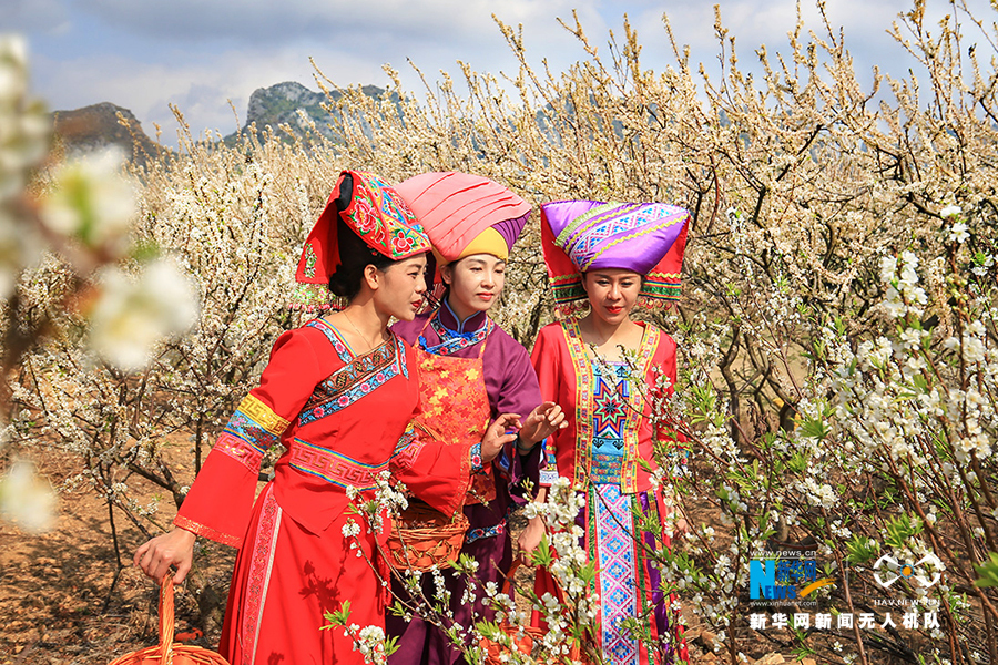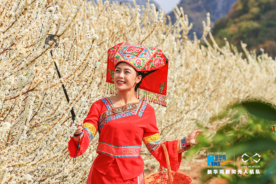 身着壮族服饰的游客在李花丛中赏花。新华网发 梁挺摄