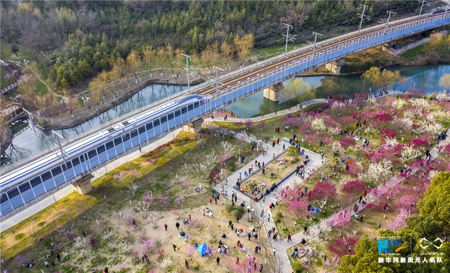 2月16日,一列“和谐号”动车驶过春意盎然的合肥匡河公园。