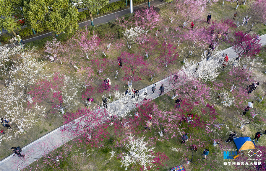 2月16日,在安徽省合肥市匡河公园里,红梅、白梅、绿梅等各色梅花争艳绽放,吸引了众多游客和市民前来赏景。