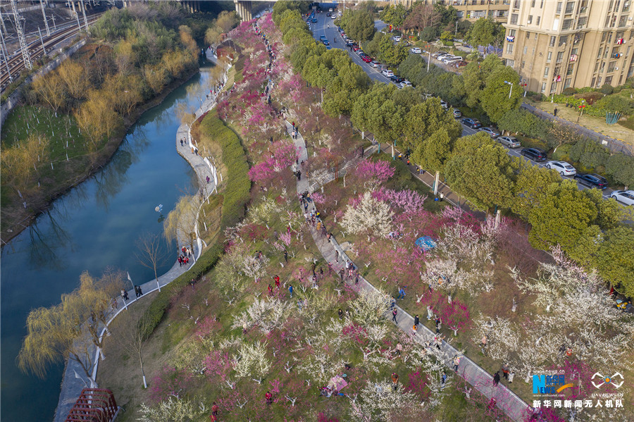2月16日,在安徽省合肥市匡河公园里,红梅、白梅、绿梅等各色梅花争艳绽放,吸引了众多游客和市民前来赏景。