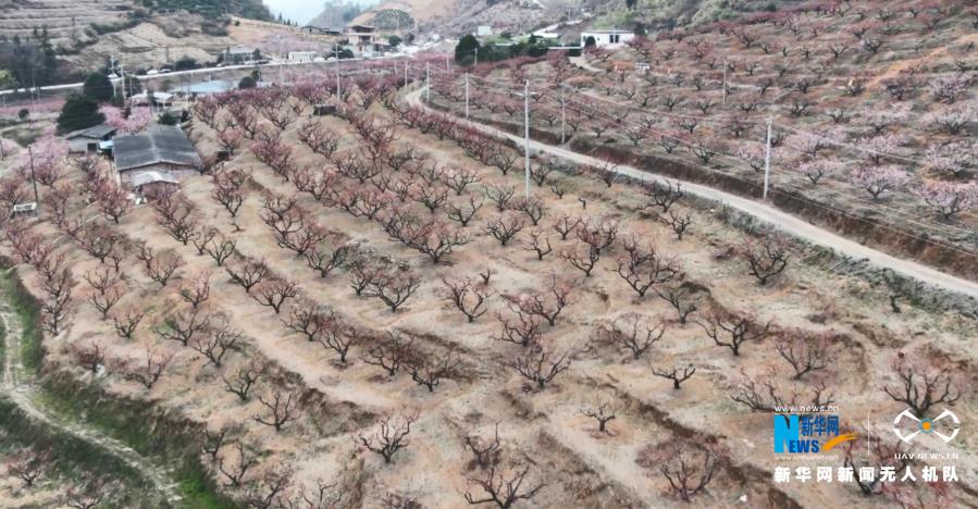 桃树长于山谷之中,顺着两边山坡盘虬而上,苍劲写意。新华网发