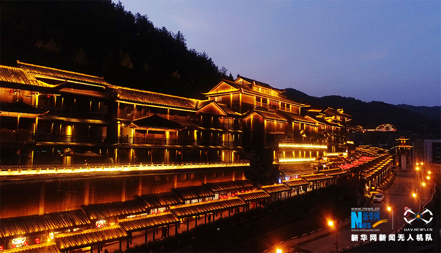 酉州古城位于重庆市酉阳县,由全长1300米民族风情街组成,是展示土家族建筑、历史、民俗、文化的“博物馆”。新春之际,酉州古城流光溢彩,夜景迷人。新华网发(陈碧生 摄)