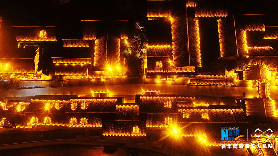 这是无人机拍摄的酉州古城,灯如昼景迷人。新华网发(陈碧生 摄)