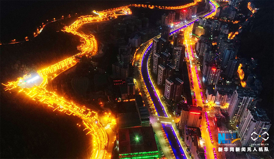 这是无人机拍摄的酉州古城,蜿蜒如灯带。新华网发(陈碧生 摄)