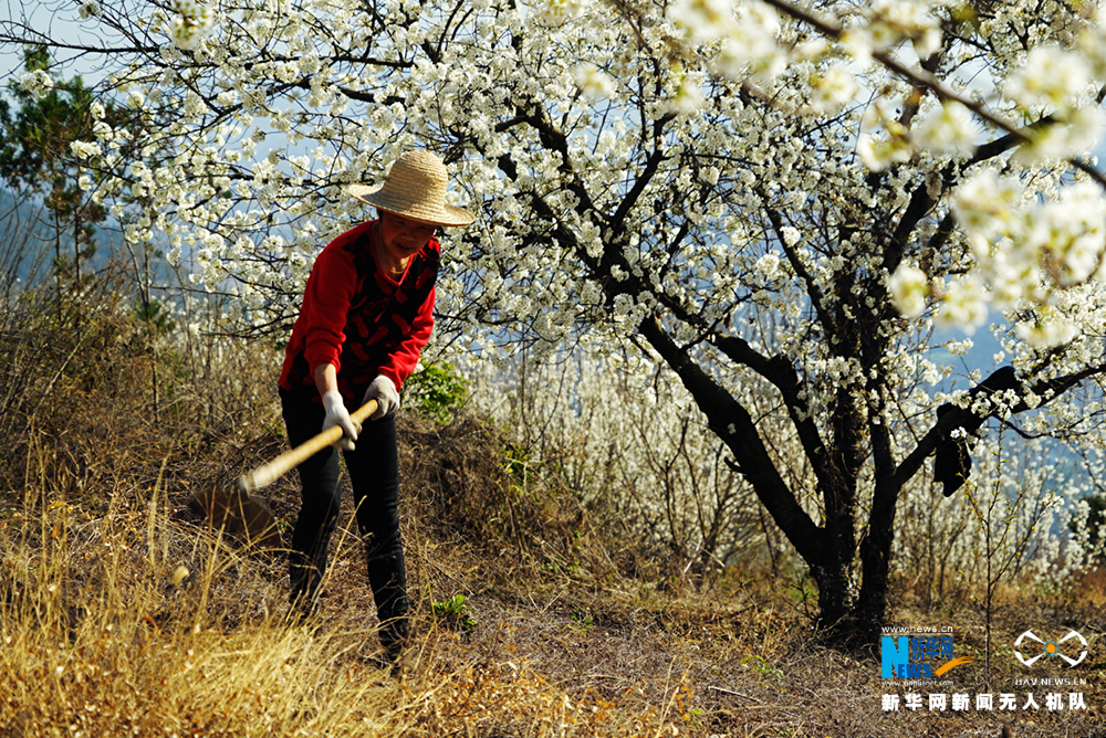 2月21日,旬阳市段家河镇薛家湾村一位村民在樱花园里锄草。赵华斌 摄