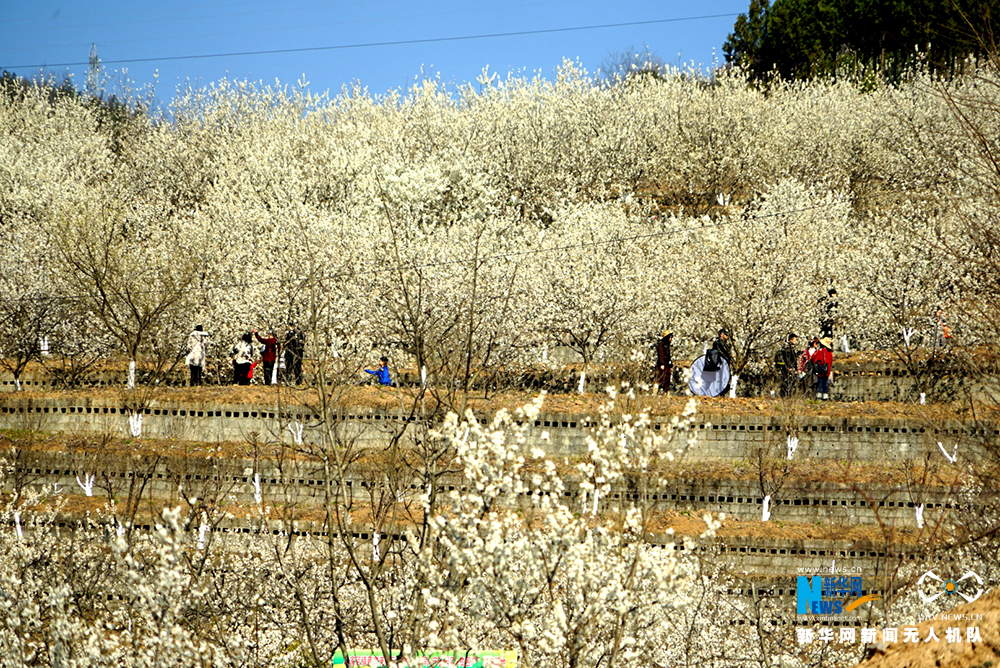 2月21日,游客们在旬阳市段家河镇薛家湾村樱桃园拍摄、游玩。赵华斌 摄
