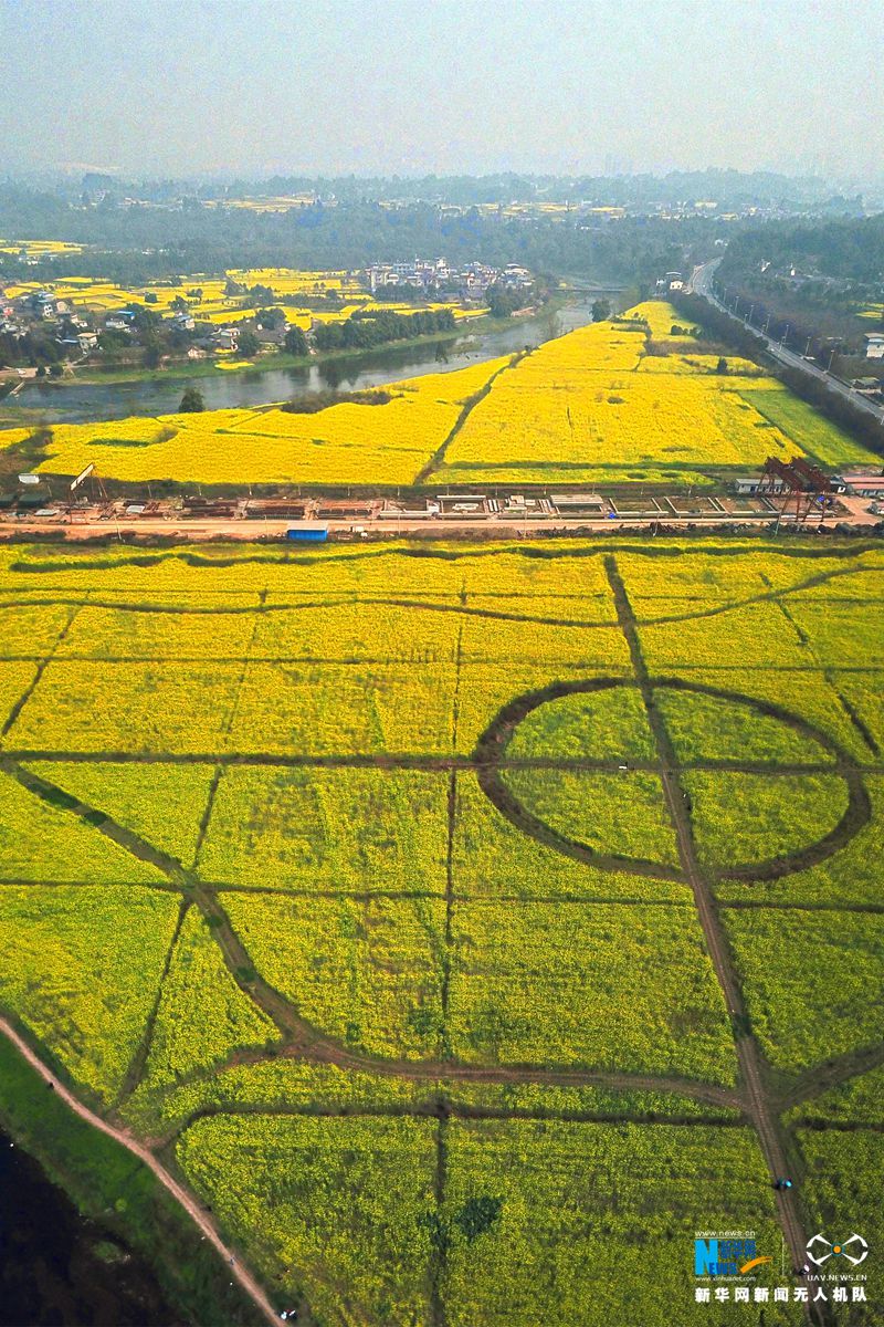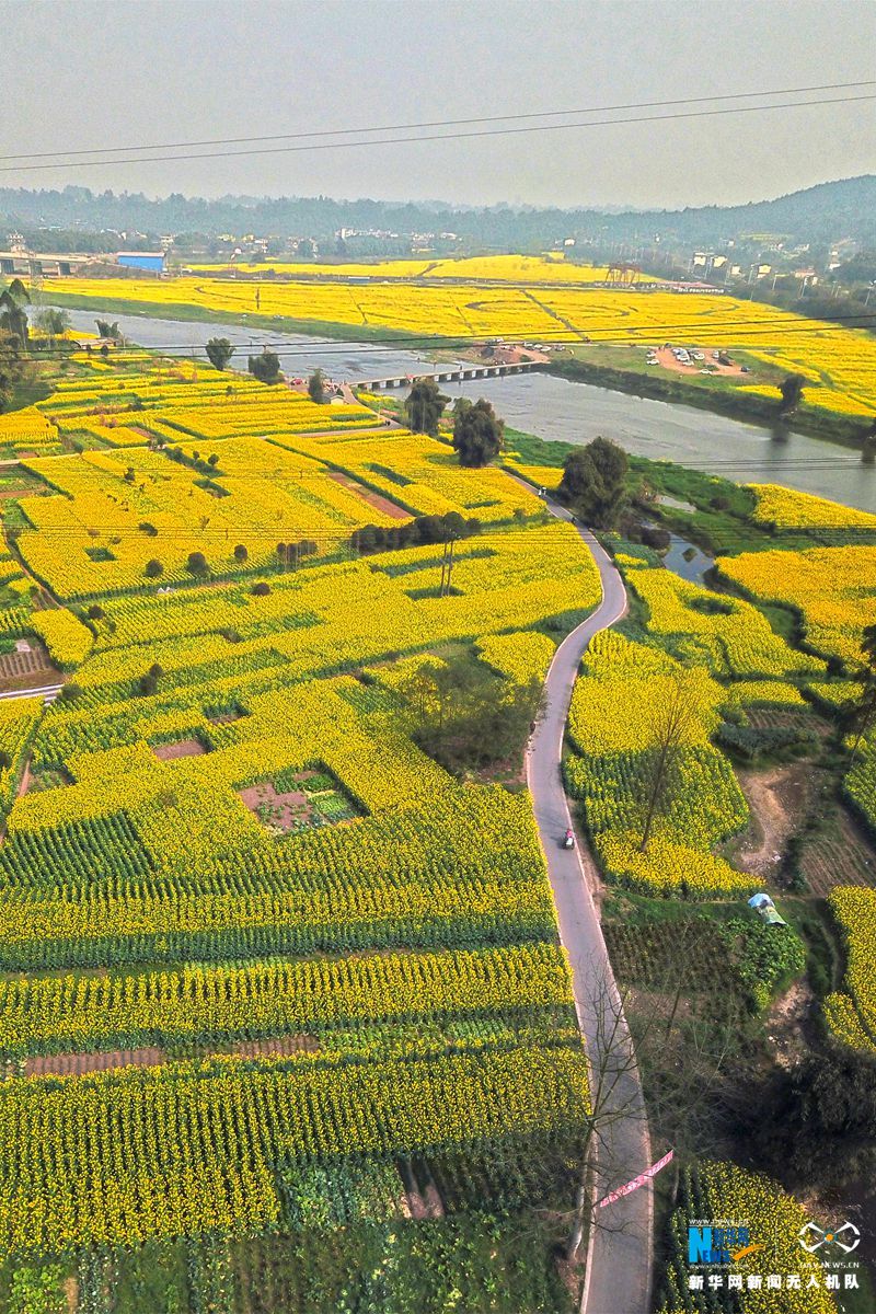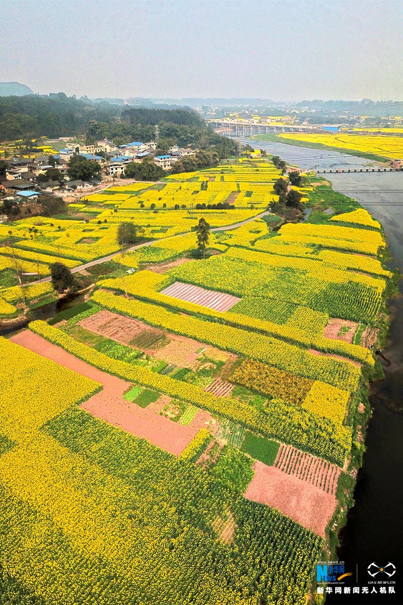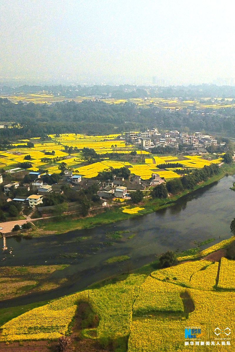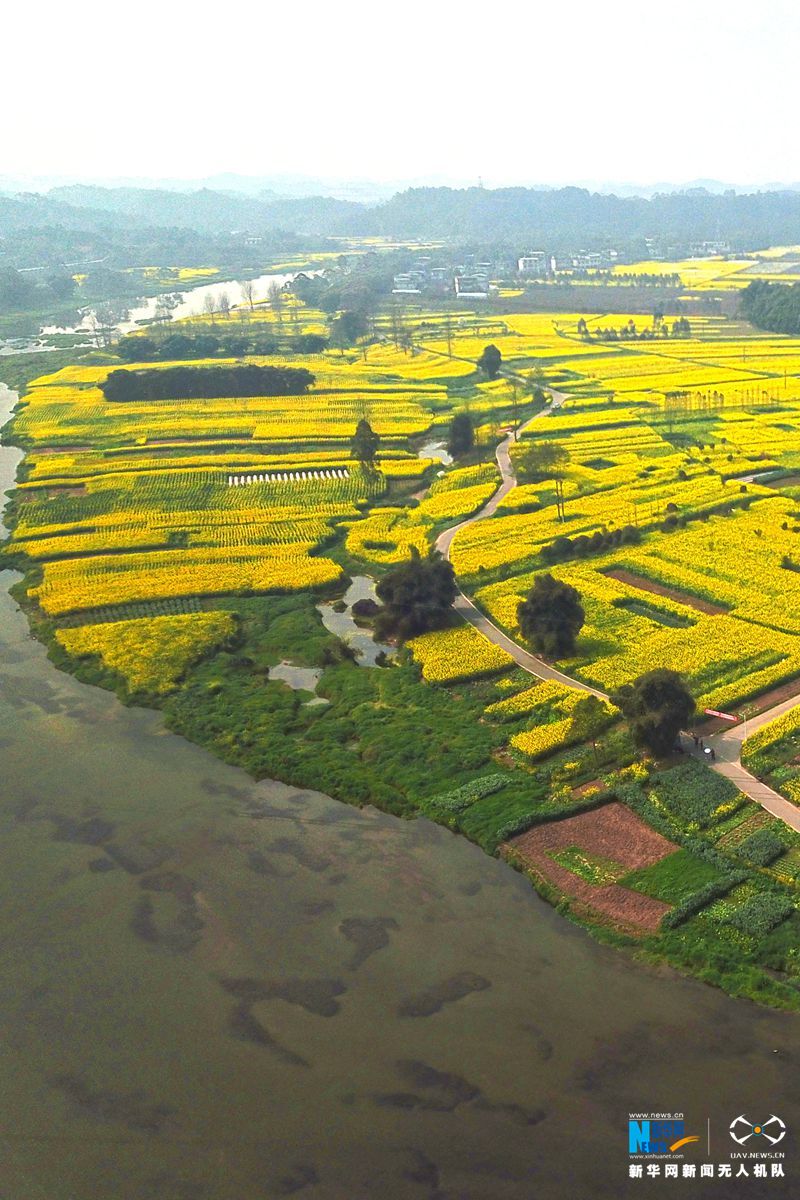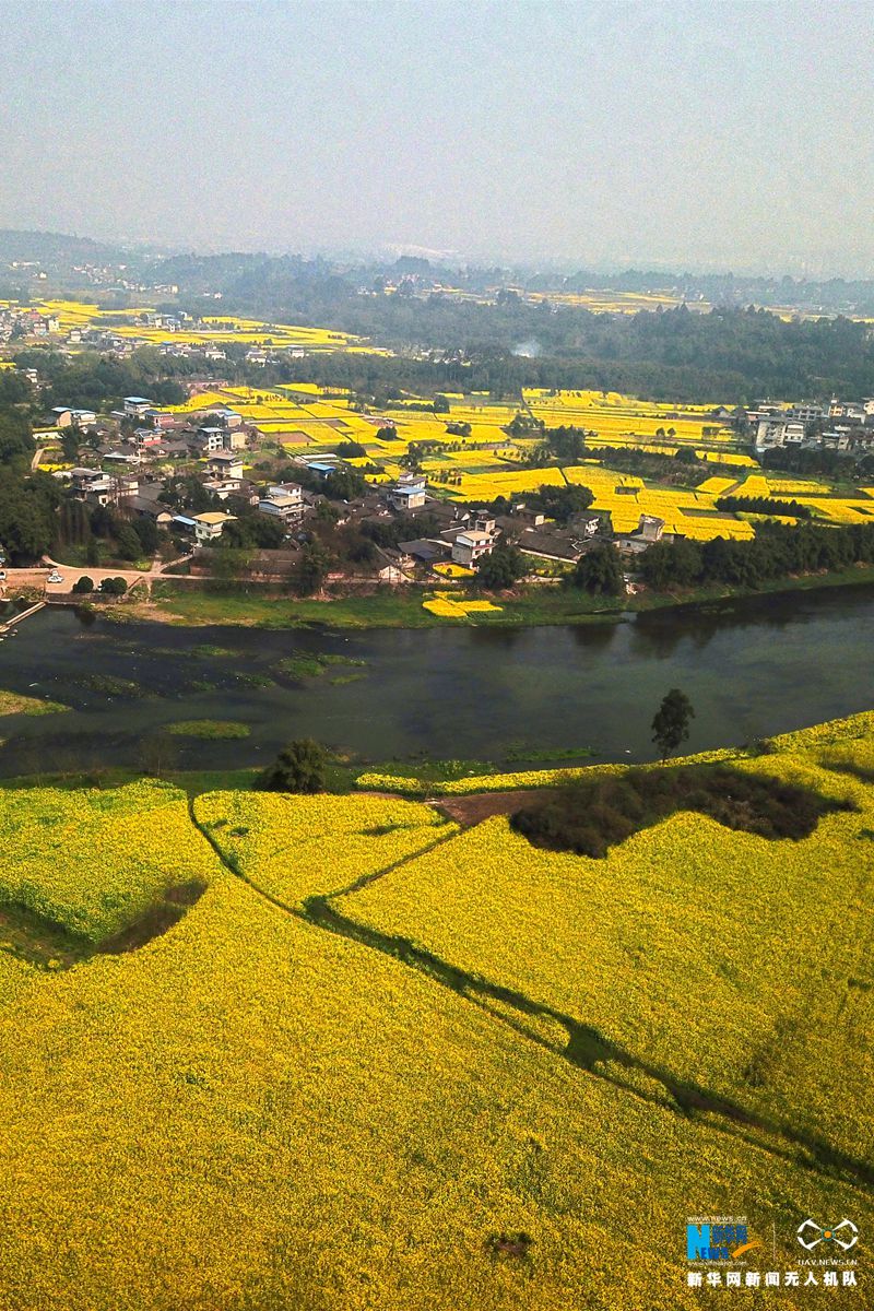 峨眉河全长60公里,主要发源于峨眉山。流经峨眉山市黄湾、符溪等乡镇后,流入乐山市中区苏稽镇、水口镇,汇入大渡河。近日,峨眉河苏稽段两岸油菜花竞相开放,峨眉河畔呈现出一派春意盎然的田园风光。(本组图片摄于2月23日 新华网黎涛摄)