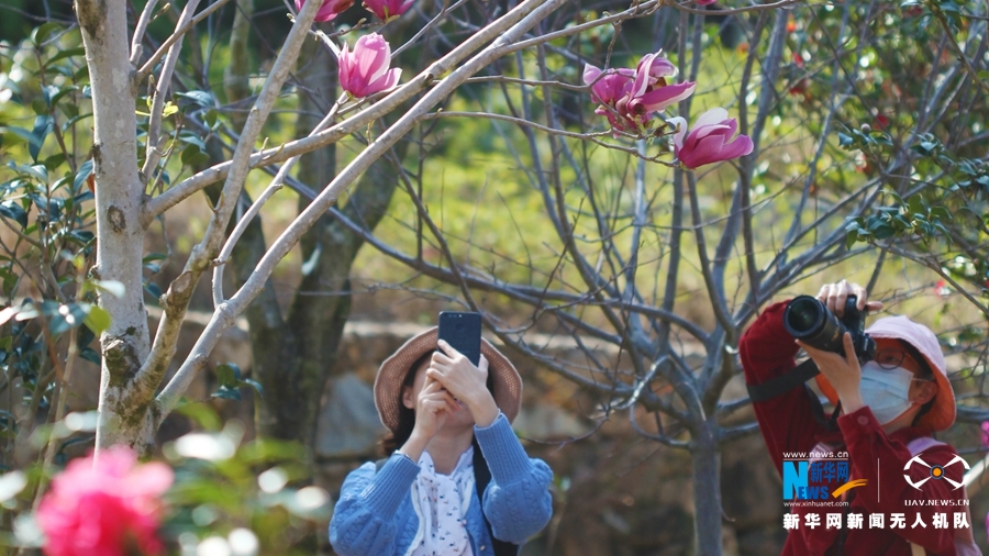 不少游客前来赏景拍花,乐在其中。新华网发(邝建华摄)