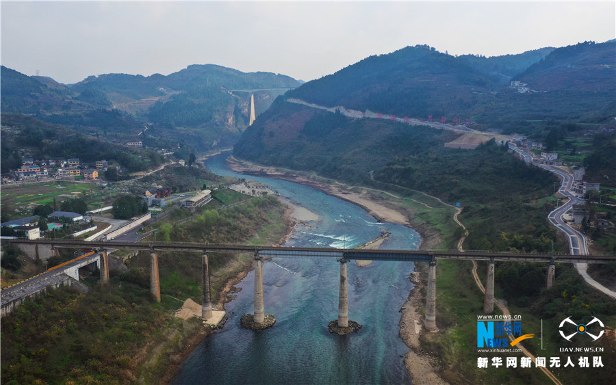 修建于60年代的川黔铁路乌江大桥与2018年通车的渝贵快速铁路乌江大桥“同框合影”(2月24日摄)。新华网 卢志佳 摄