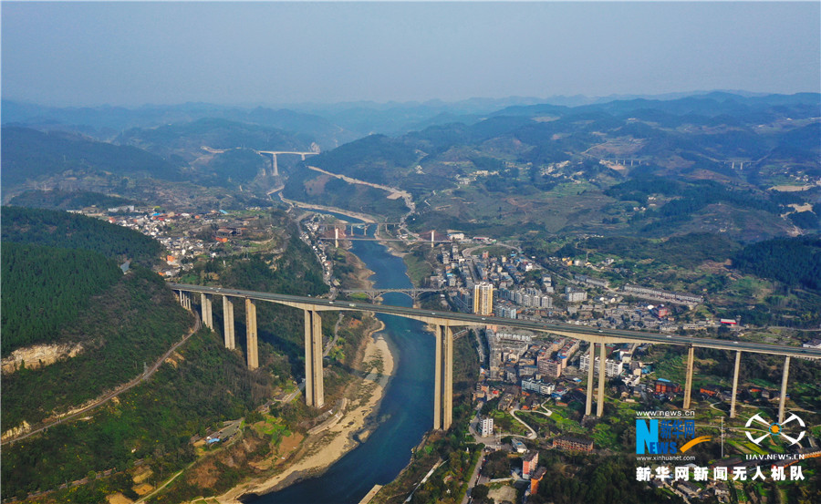 航拍贵州遵义乌江镇五桥横跨乌江(2月24日摄)。新华网 卢志佳 摄