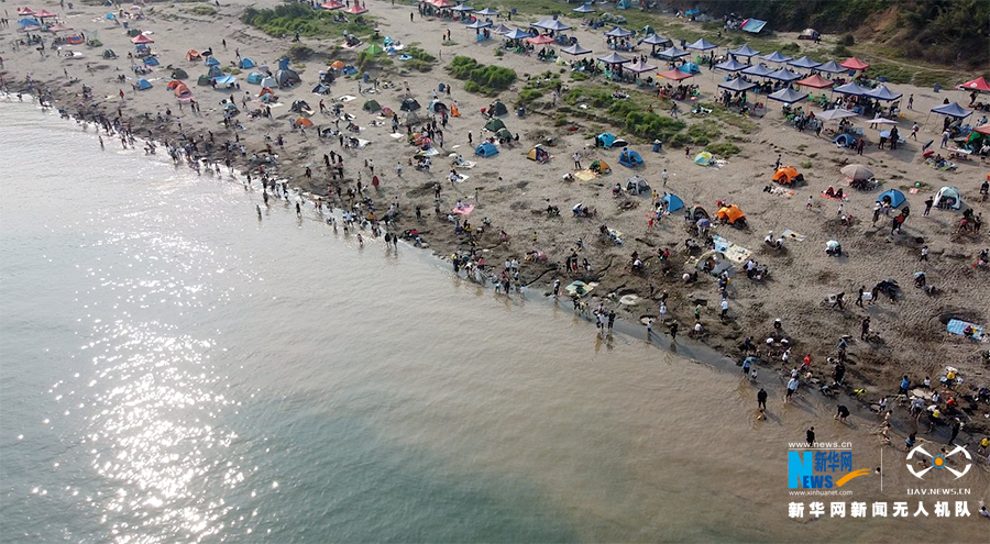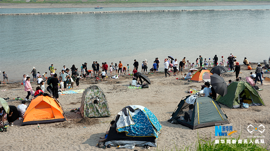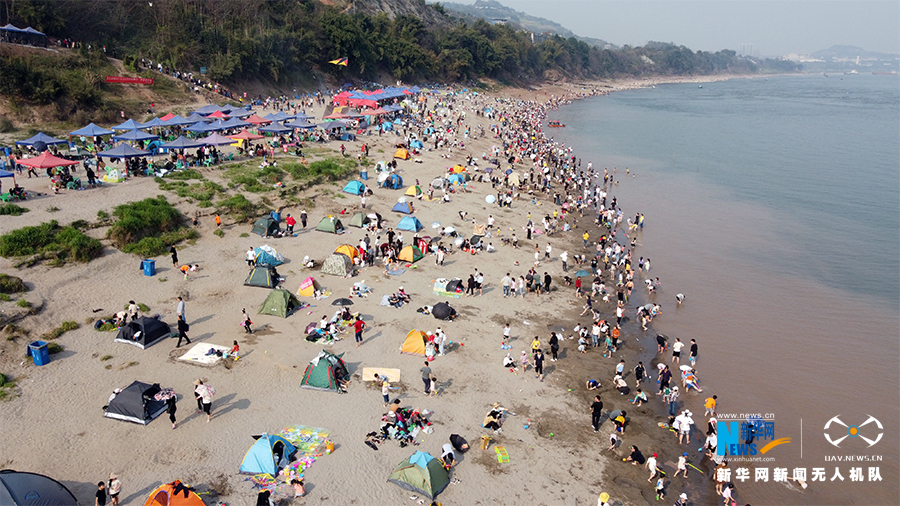 这是一片紧邻长江的优质沙滩,沙滩岸线长约800米,面积约40亩。这里水好、岸绿、沙软,短短几天时间,吸引超过十万人次前来打卡。新华网 马天龙 摄