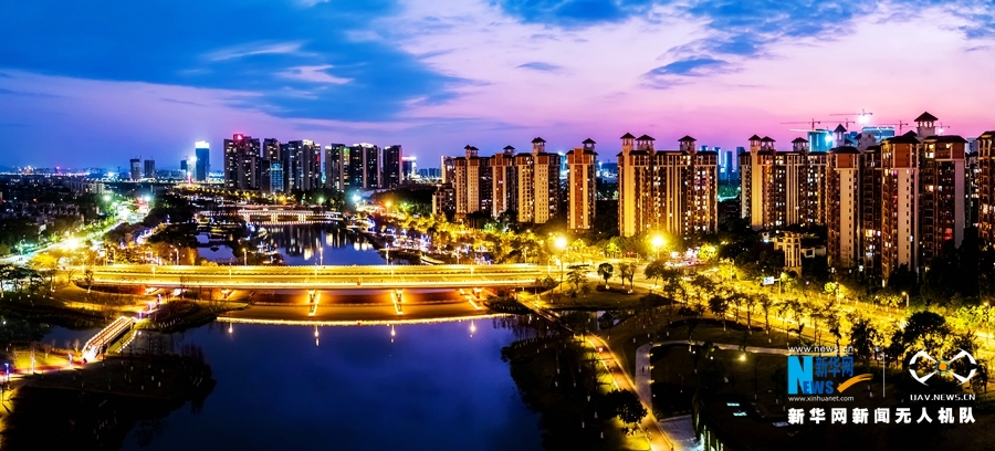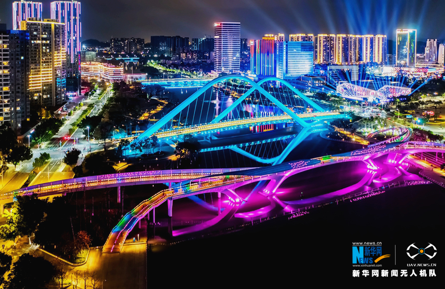 在沿岸楼体景观灯带的映衬下,绘出迷人的城市夜色。新华网发(曾铠钢摄)