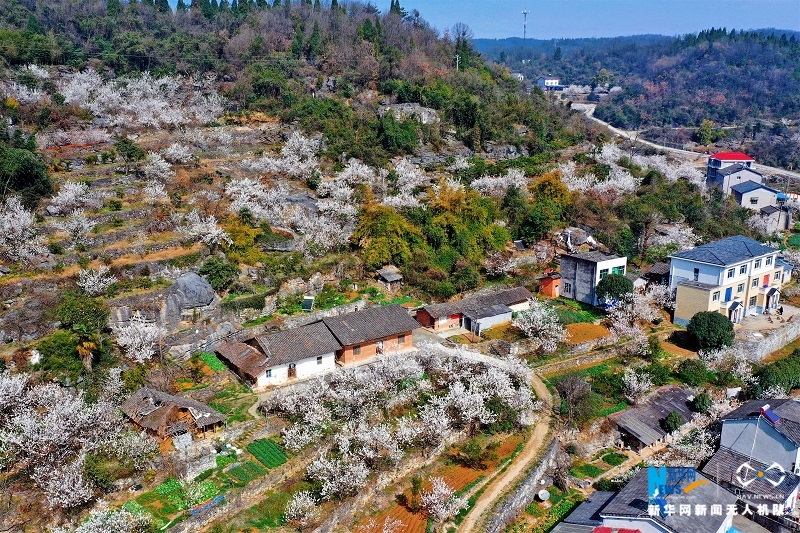 湖北省宜昌市夷陵区文仙洞村漫山遍野的樱桃花竞相开放。新华网发(张国荣摄)