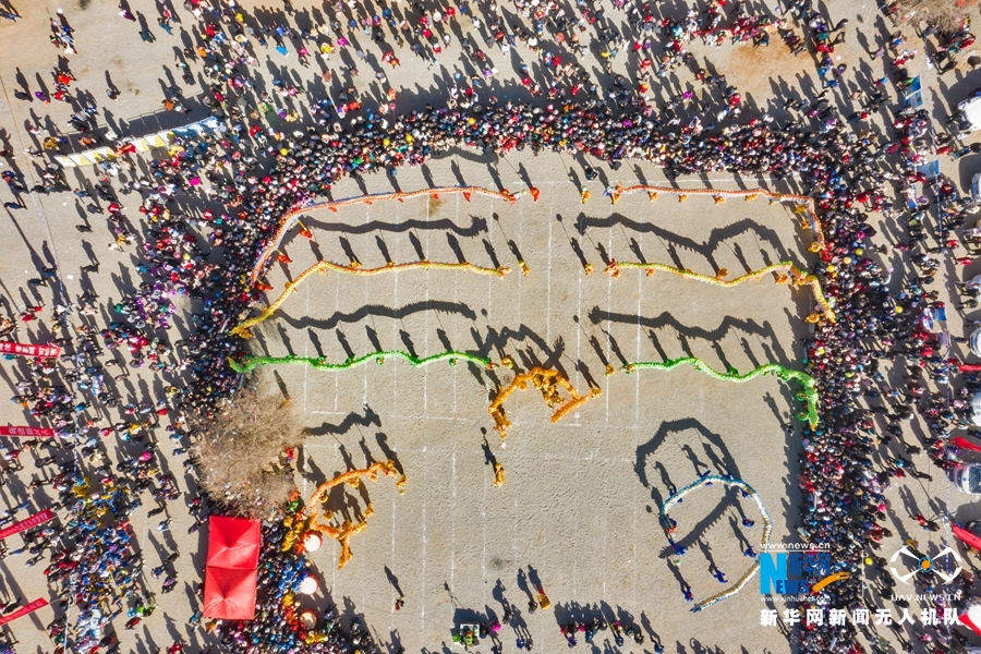 3月14日,甘肃省张掖市民乐县现代丝路田园综合体中心广场举行的舞龙表演。新华网发(成林 摄)