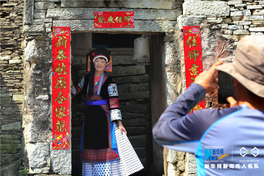3月18日,游客在贵州镇宁高荡村游玩拍照。新华网 卢志佳 摄