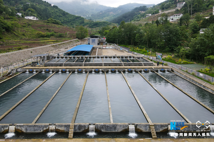 航拍三建乡蔡森坝村冷水鱼养殖基地。通过生态流水养殖把资源优势转化为产业优势,带动当地群众实现持续稳定增收。新华网 耿骏宇 摄