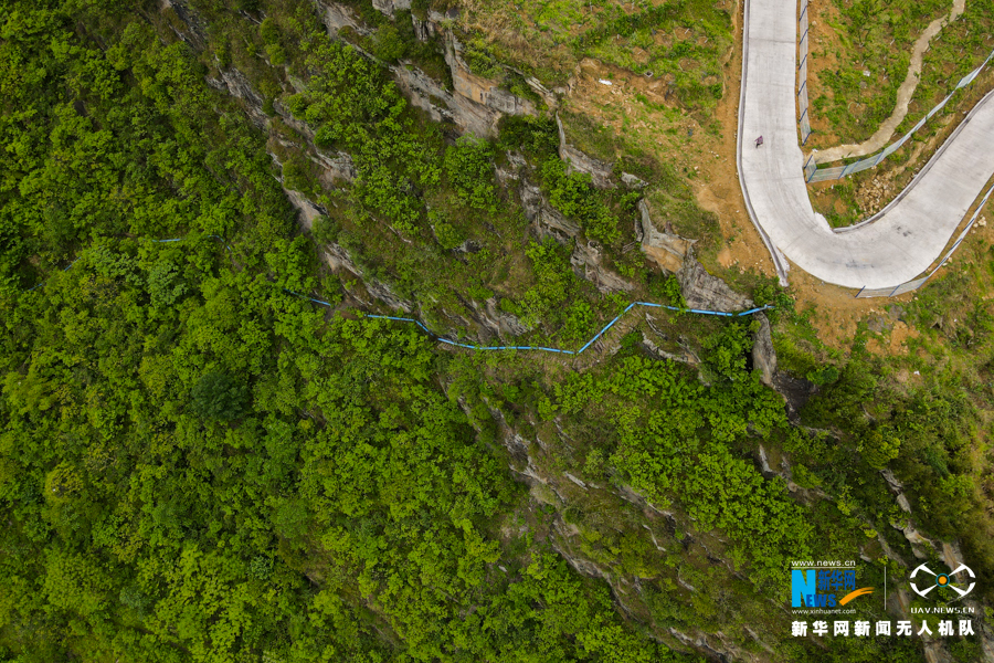 航拍三建乡悬崖边上的引水管道。缺水曾是制约三建乡产业发展的关键因素,三年多来,三建乡全面建成“多渠道进水、多个池子蓄水、多个龙头用水”的“长藤结瓜”产业水系配套工程,解决了产业用水的难题。新华网 耿骏宇 摄