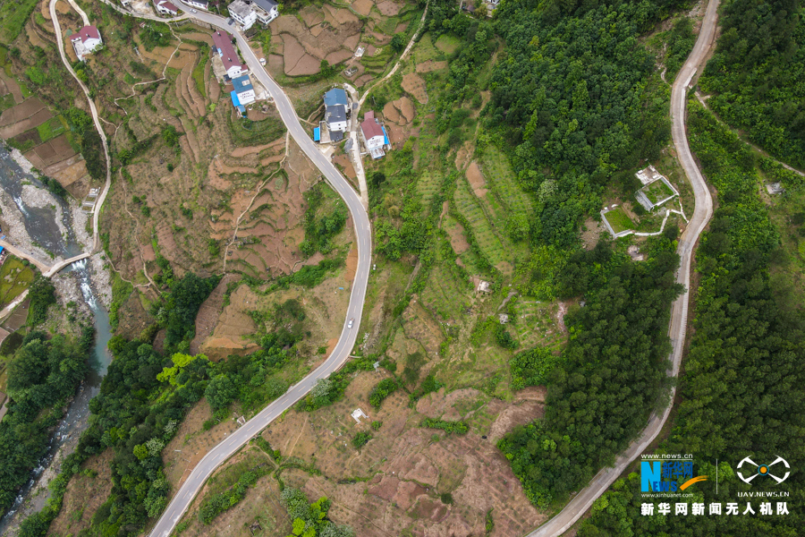 航拍三建乡夜力坪村的农村公路,在群山之中蜿蜒盘旋。新华网 耿骏宇 摄