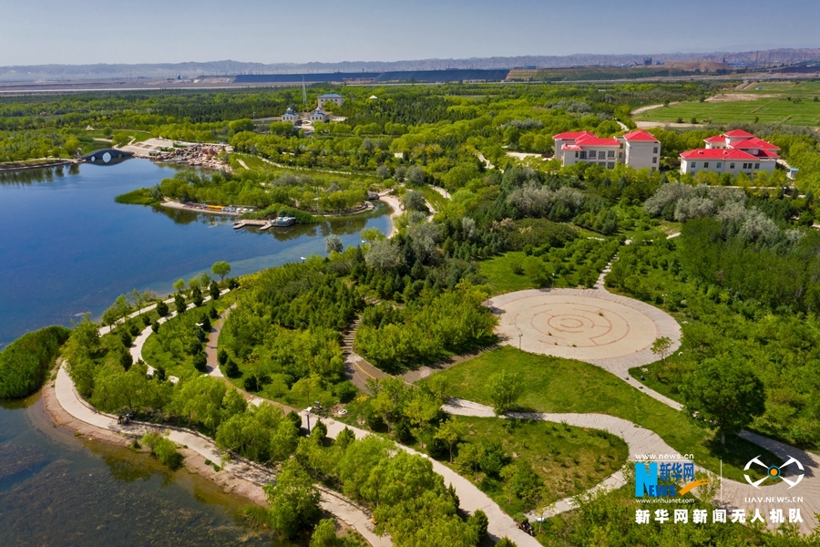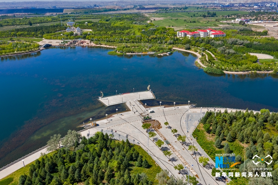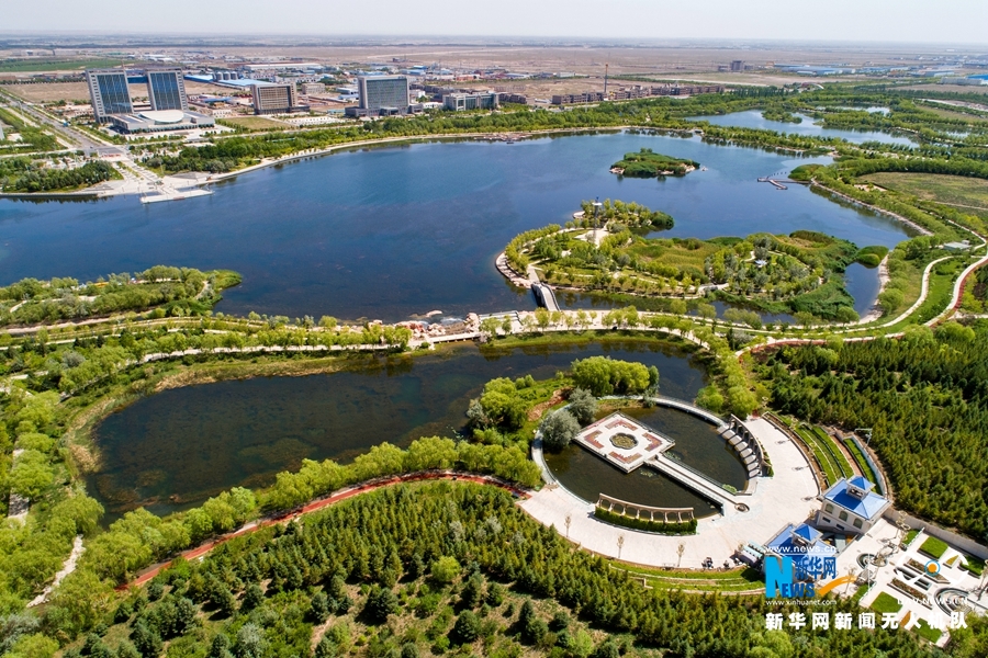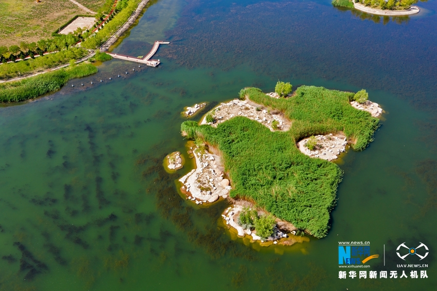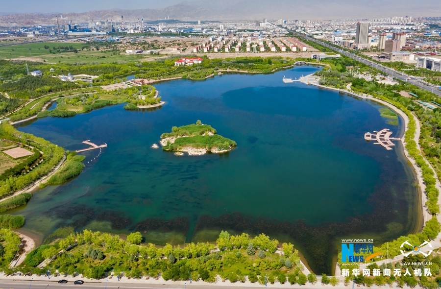 这是近日航拍的位于甘肃省金昌市金川区的金水湖国家湿地公园风光。金水湖湿地公园由五个不同面积的湖面组成,岛屿、桥梁、半岛、堤岸、码头等点缀其中、相映成趣。新华网发(成林 摄)