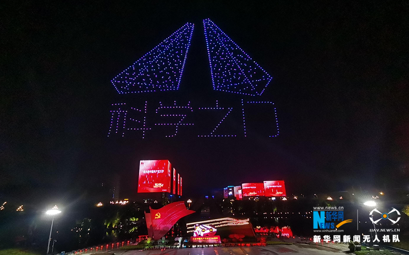 广州黄埔区2021架无人机光影秀共庆中国共产党百年华诞。图为无人机表演。新华网发(罗柱梁摄)
