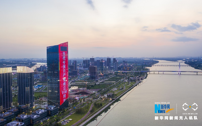 广州南沙区举办光影秀活动,营造共庆中国共产党百年华诞浓厚氛围。图为明珠湾亮灯。新华网发(刘伟摄)