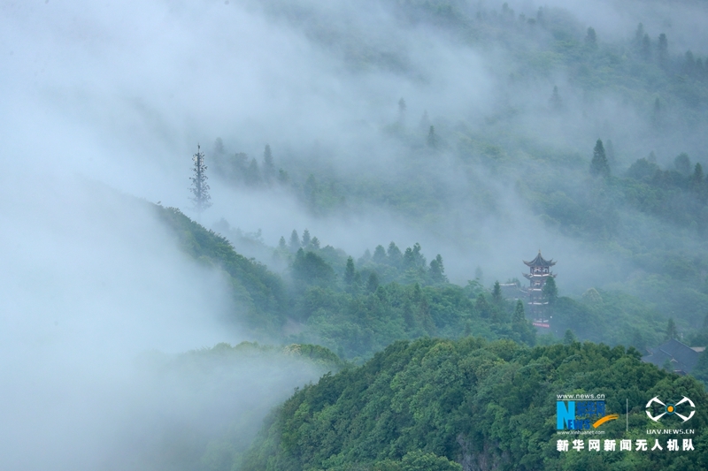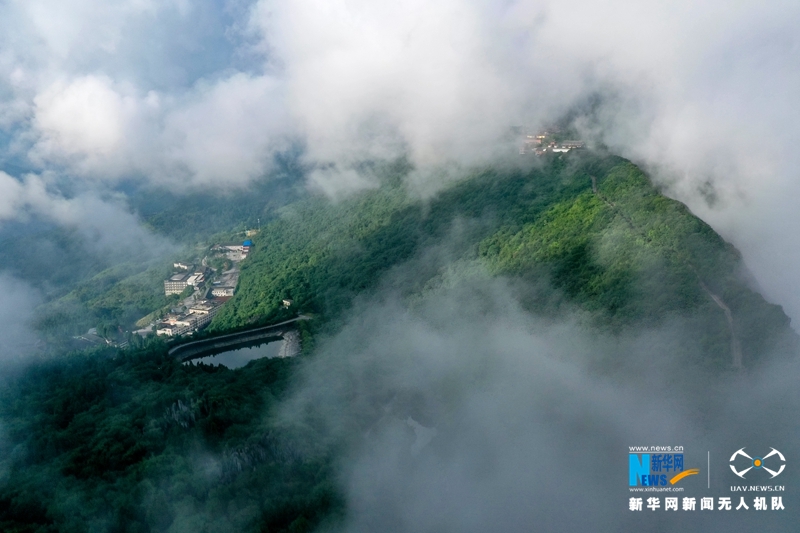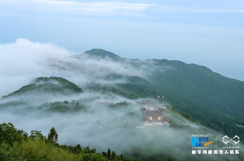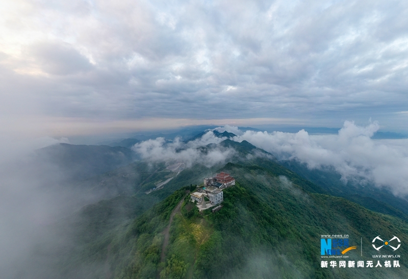 2021年7月4日,云雾缭绕的四川省广安市华蓥山最高峰高登山寺(无人机照片)。