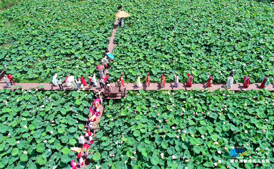 粉嫩的荷花竞相开放,呈现碧荷连天的美景。