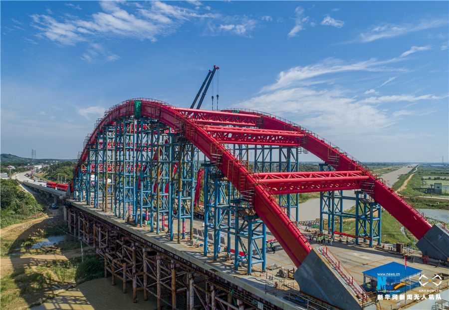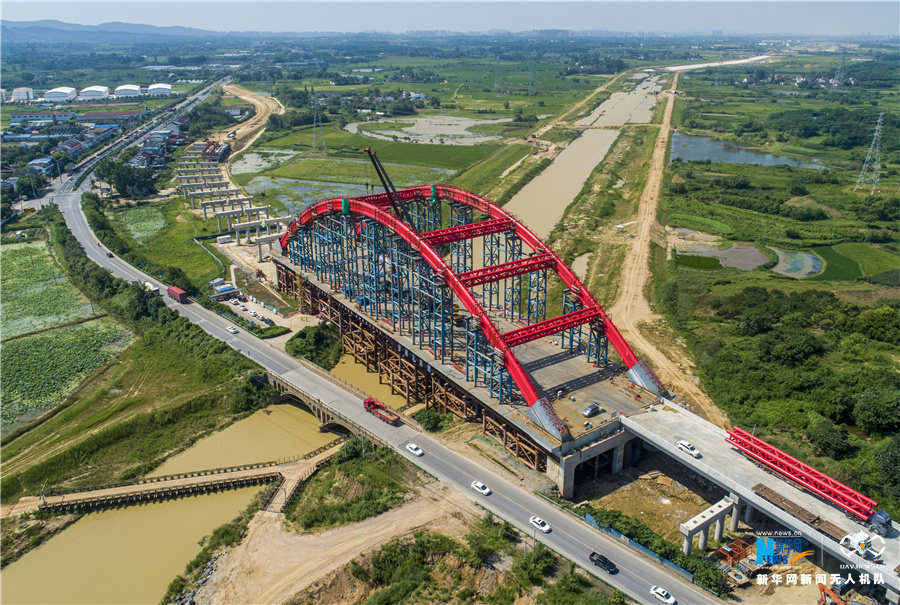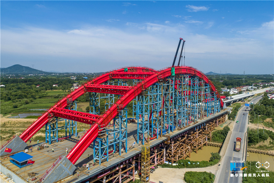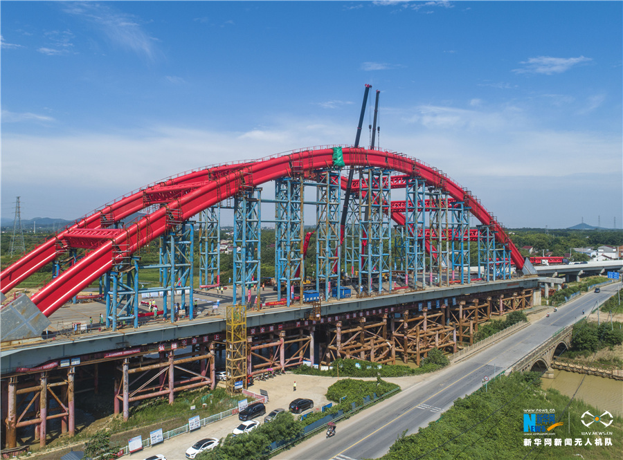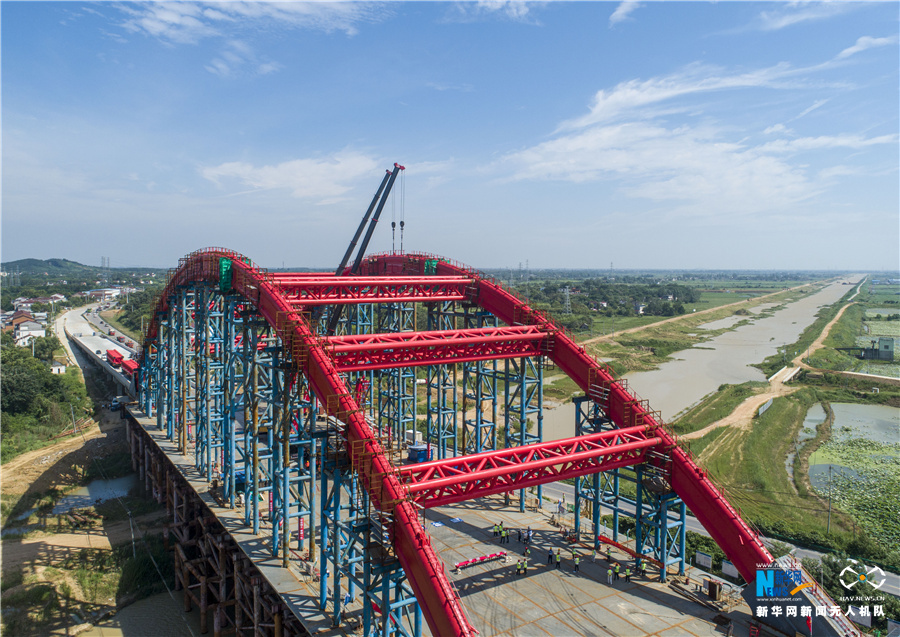 7月12日,安徽省合肥市庐江县庐城镇境内的引江济淮工程罗埠大桥钢管拱成功合龙。