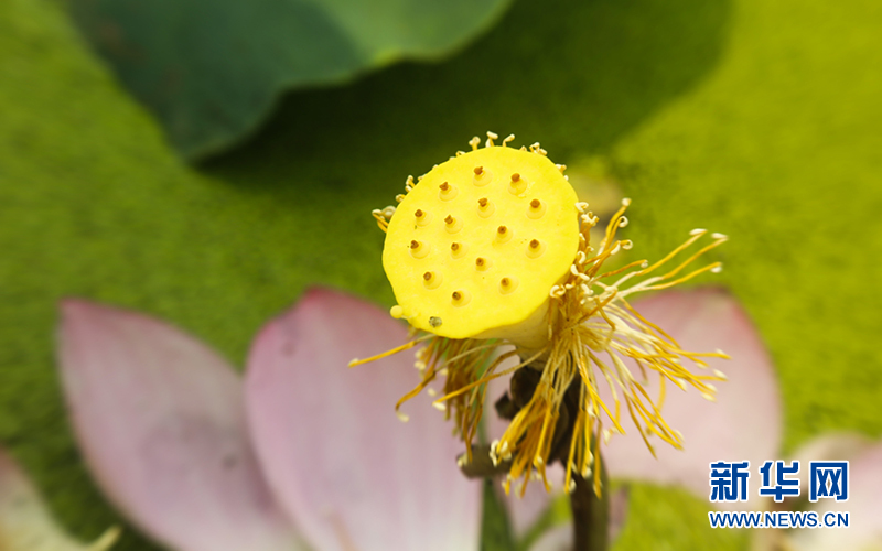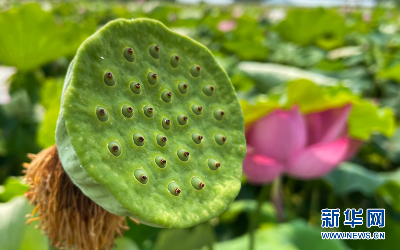 这里的荷花主要用于观赏,荷花凋谢后成熟的莲蓬用于出售,形成了一条“观赏+销售”的产业链。新华网发(徐宁 摄)