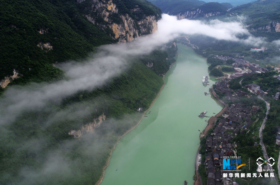 在重庆龚滩古镇,雨后云雾景观,如絮如烟、美不胜收,游船穿行如入仙境。新华网发(陈碧生 摄)