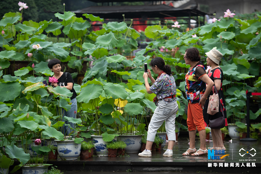 图为游客在重庆市九龙坡区华岩寺景区内的七步荷塘中穿行。新华网 耿骏宇 摄