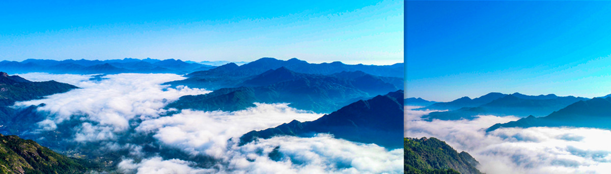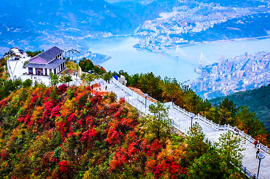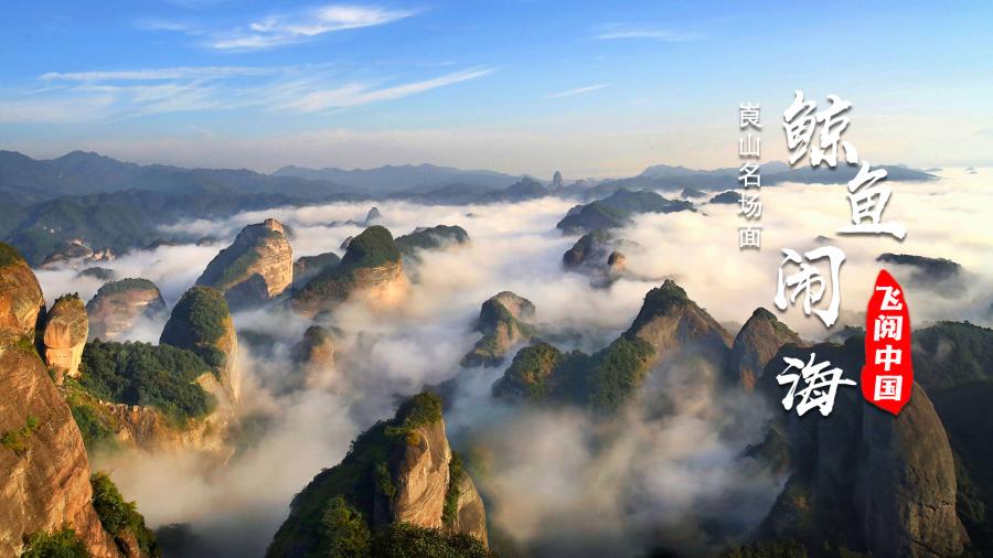 冬季清晨,崀山雾气升腾。浮云缥缈之中,丹霞群山逶迤起伏,大小百余座赫红色奇峰,酷似一群在云海中飞腾嬉戏的巨鲸,时而被云雾吞没,时而露出首尾。
