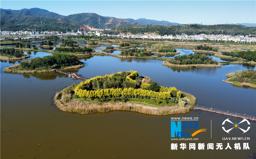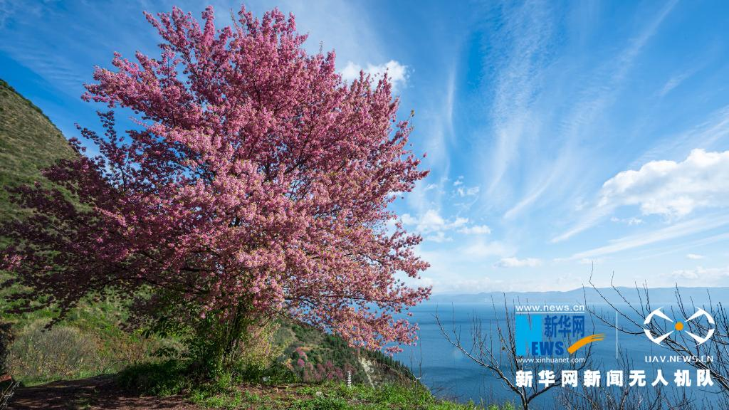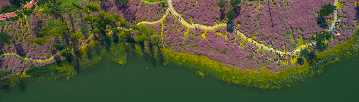 红花依碧水,仙湖早争春。在北方正冰天雪地的时候,云南澄江抚仙湖畔却红翠相染,山花烂漫,依旧温暖如春。冬樱花与绿树、蓝天、碧水,共同构成一幅色彩斑斓的山水画卷。
