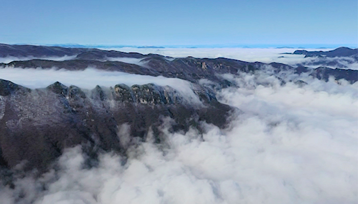湖南省郴州市宜章县莽山五指峰景区因为冷暖空气在此交汇,形成了逆温层,山上阳光明媚,气温高,山下气温低,或阴雨绵绵、或结冰成型,中间是云海。