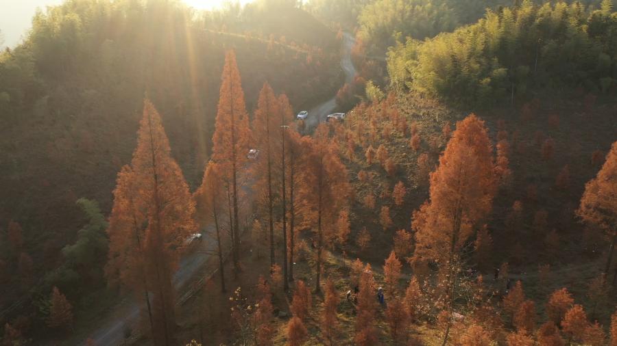 冬日时节,位于怀化市鹤城区的水杉林悄悄地换上了“冬装”,一排排绯红的水杉在冬日里绽放,层林尽染,美轮美奂,吸引众多游客前往观景。