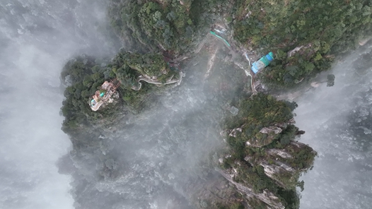张家界永定区七星山的莽莽群山银装素裹,云雾在雄奇险峻的山峰之间缠绕升腾,雪铺陈在巨大雄浑的台型地貌上,犹如漫无边际的白色绸缎,整个七星山就像一幅奇幻风格的CG插画,让人震撼。