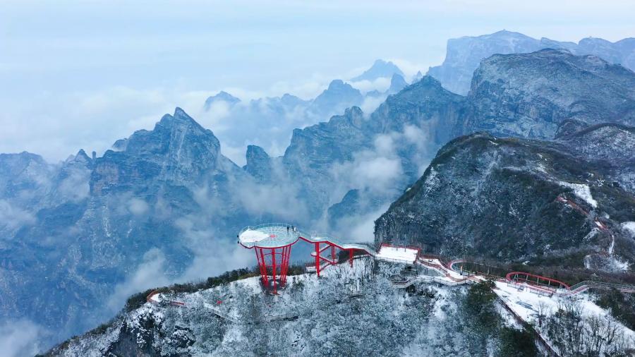 1月6日,湖南省张家界市迎来新年第一场雪。在海拔1500多米的天门山上大雪纷飞,让雄奇的群峰披上了银装。远处的云气缠绕在墨色的群山间,近处的树枝被雾凇染白了头。行走在这如水墨画般的风景中,宛若置身仙境。(苏峥嵘 覃少波 邵颖 丁文国)
