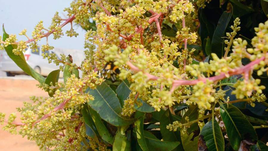 连日来,在广西百色右江区四塘镇六合村的全国“一村一品”芒果示范基地里,这里的17800多亩芒果树正开着淡黄色的小花。