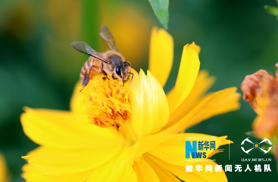一只蜜蜂在菊花上采蜜。黄汝德 摄