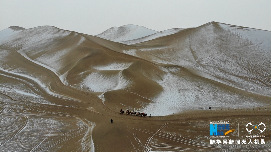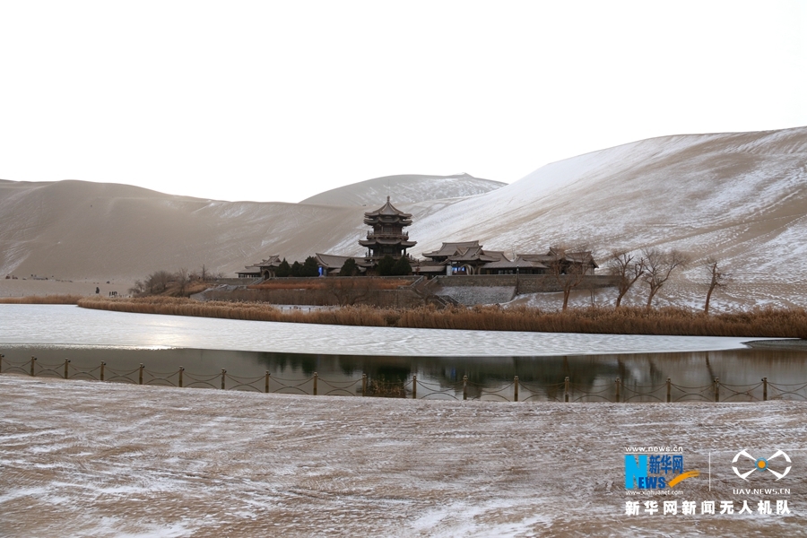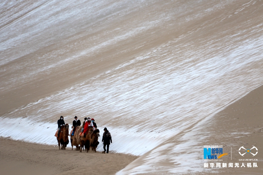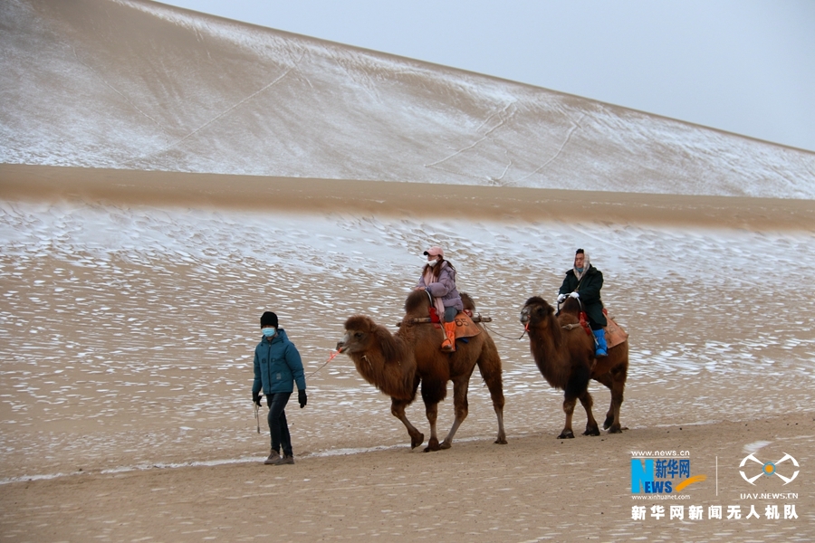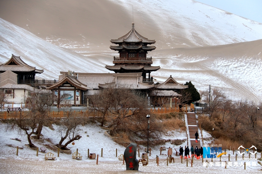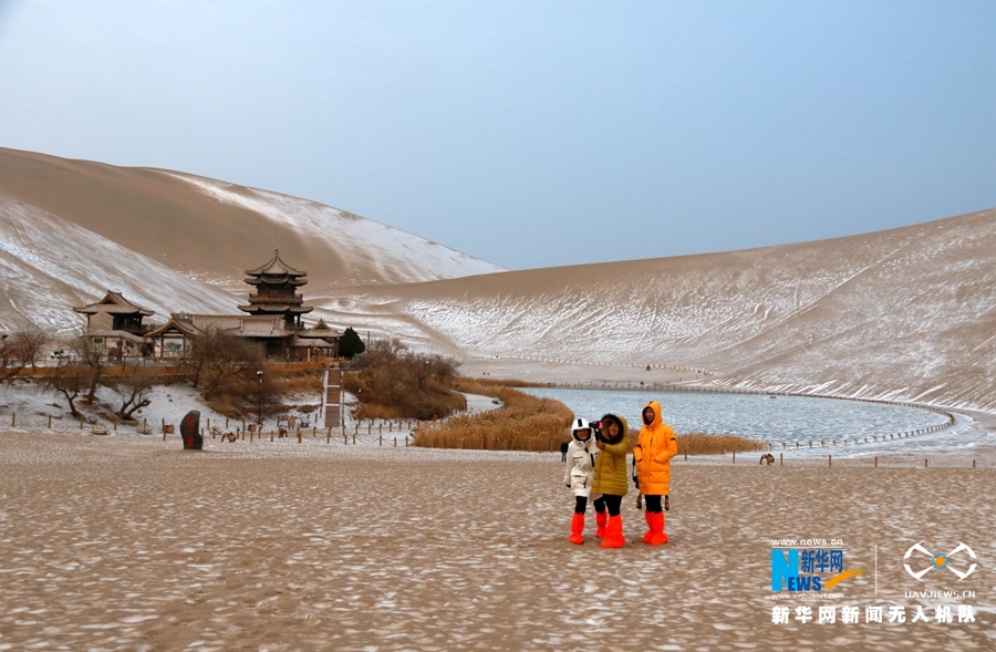 受冷空气影响,12月8日甘肃省敦煌市迎来降雪。当地著名景区鸣沙山月牙泉雪景如画,美不胜收,吸引游客踏雪赏景。新华网发 (张晓亮 摄)