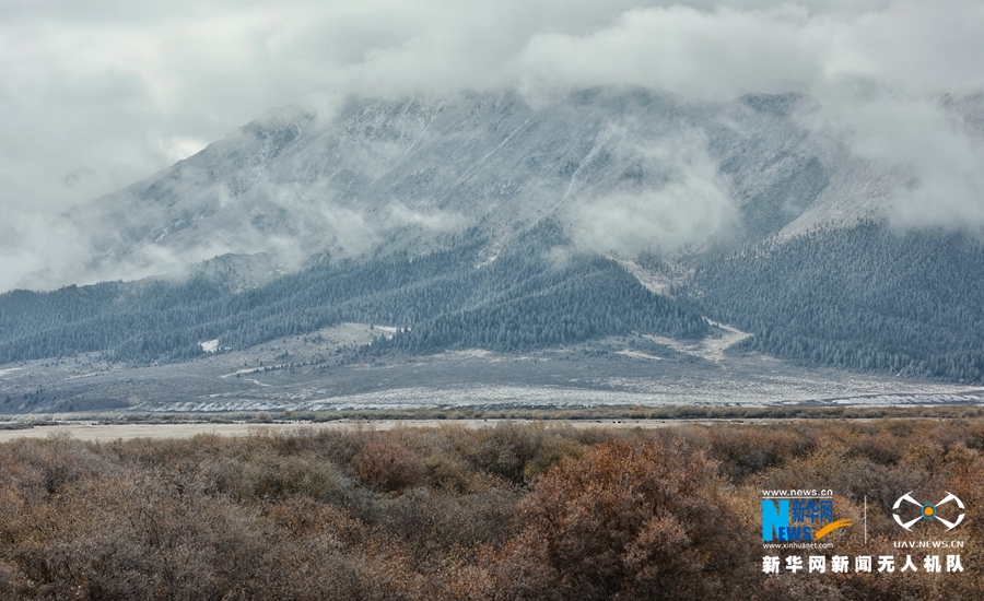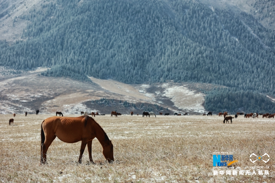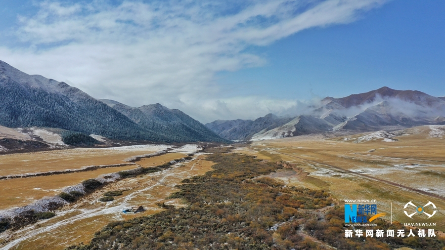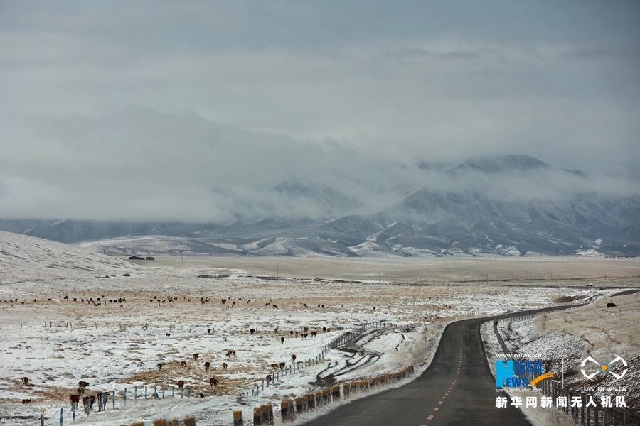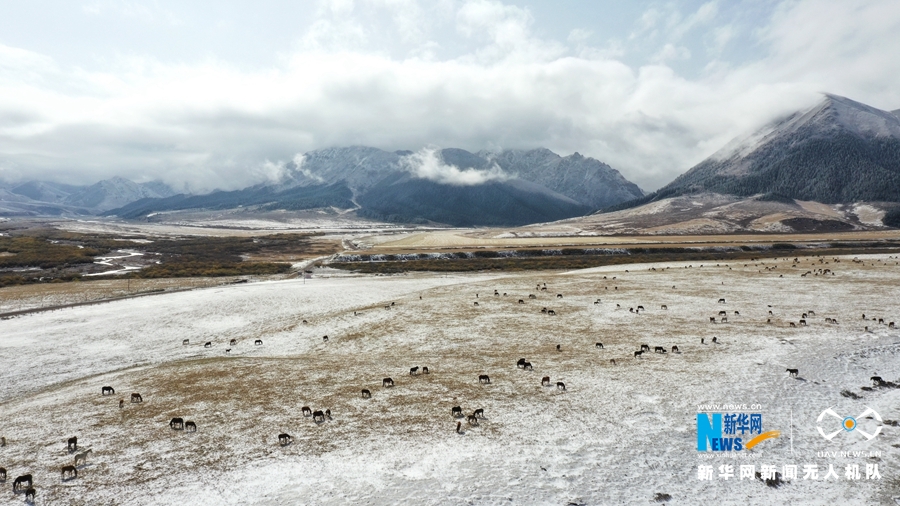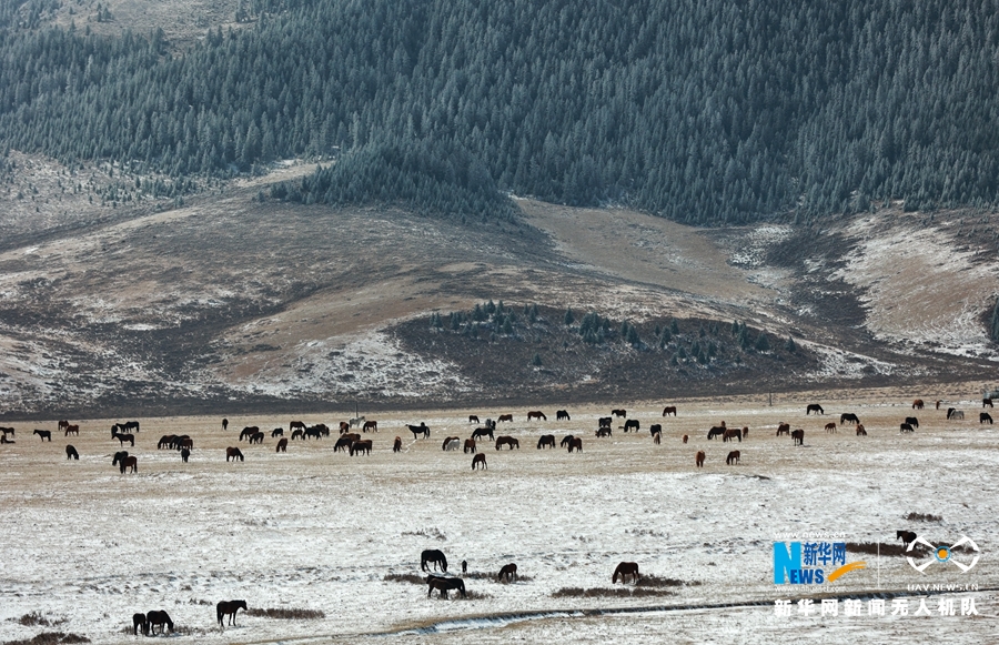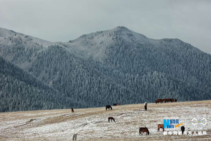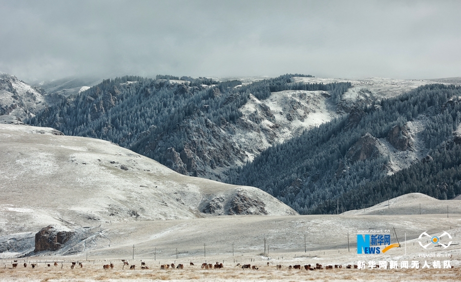 10月9日,受冷空气影响,位于甘肃省河西走廊中部的山丹马场迎来降雪天气,降雪让秋日草原披上了洁白银装,一派北国风光。新华网发 (王超 摄)