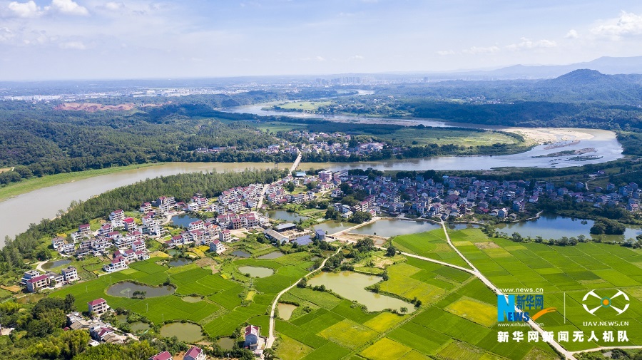 时值初秋,从空中俯瞰江西省万安县五丰镇邓林村,错落有致的村庄、一望无际的稻田和蜿蜒向前的江水,共同构成一幅美丽的秋日乡村画卷。