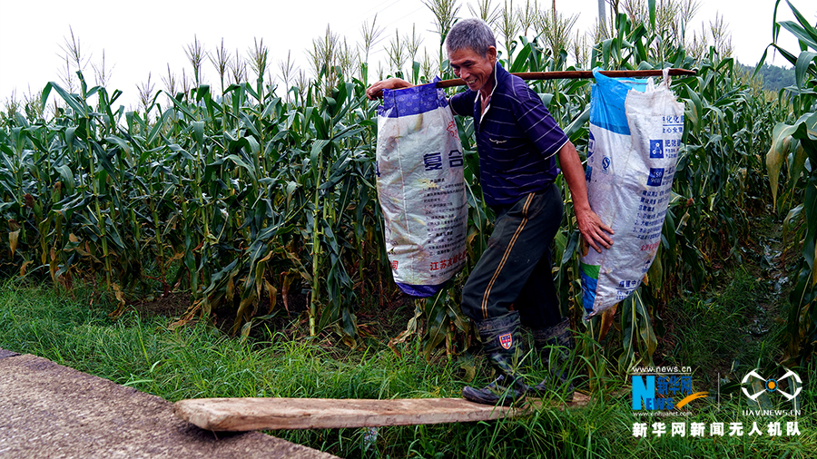 农民将玉米打包挑至收购点。新华网发(张凌波 摄)