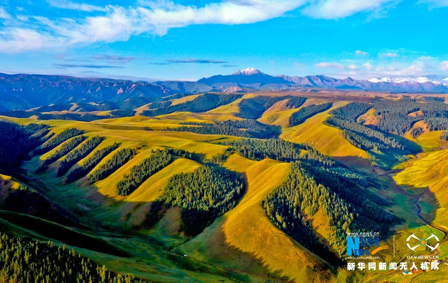 初秋清晨,位于祁连山北麓的甘肃省张掖市肃南裕固族自治县康乐草原风景秀丽,草甸、树木、山峦被秋色和朝阳浸染,仿佛笼罩着一层薄薄的金纱,吸引了各地游客前来参观游览。