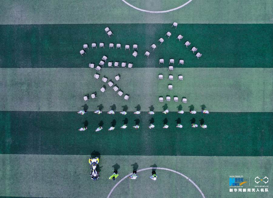 8月29日,在安徽省铜陵市义安区实验小学操场,铜陵市公安局义安分局交警和学生摆出“安全”造型。
