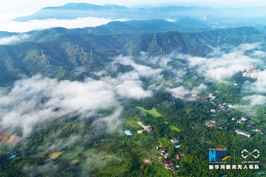 初秋时节,湖北省咸宁市潜山脚下出现壮观的云雾景观。航拍镜头下,群山在云雾中若隐若现。(陈周璇、赵忠志)