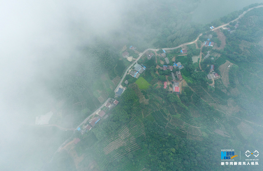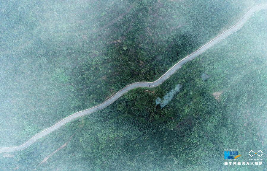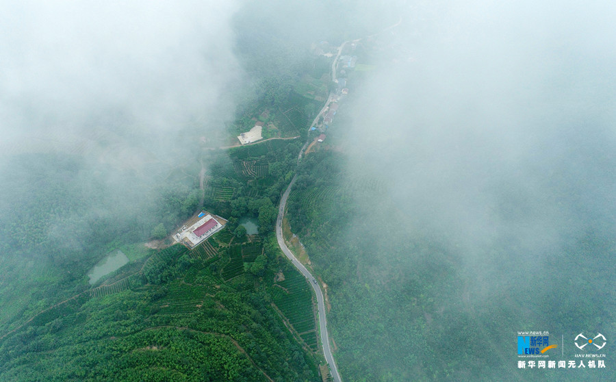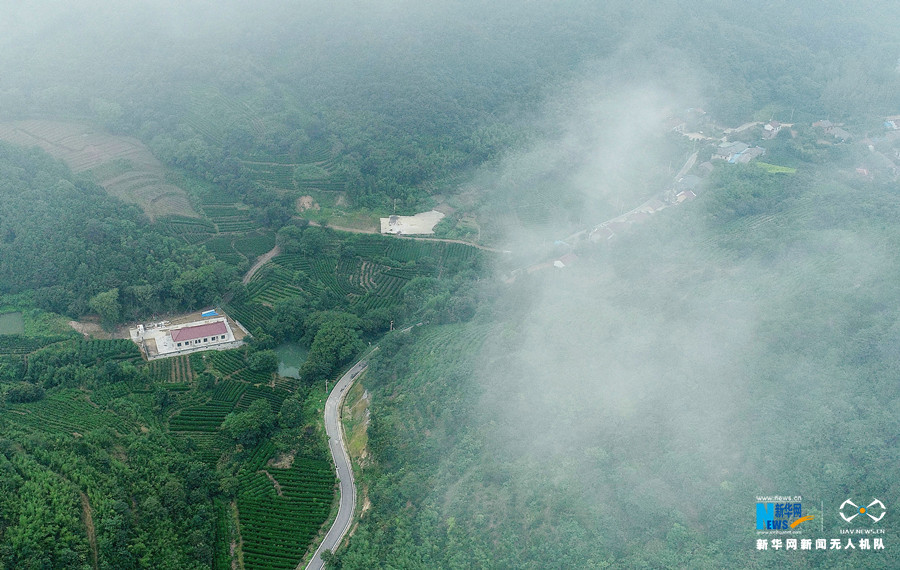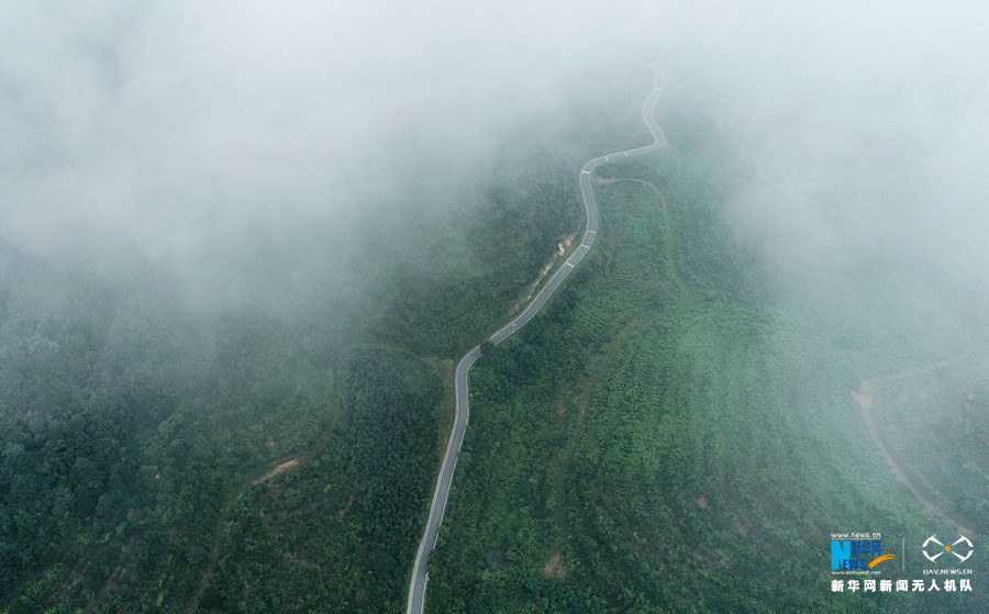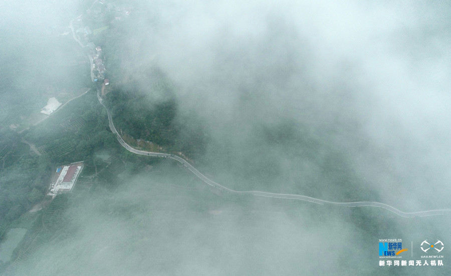 初秋时分,安徽省合肥市庐江县万山镇雨后初霁,云雾缭绕,穿山而建的乡村公路在云雾中时隐时现,宛若仙境。新华网发(王闽 摄)