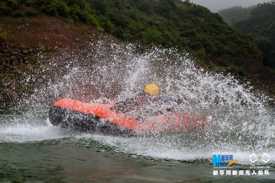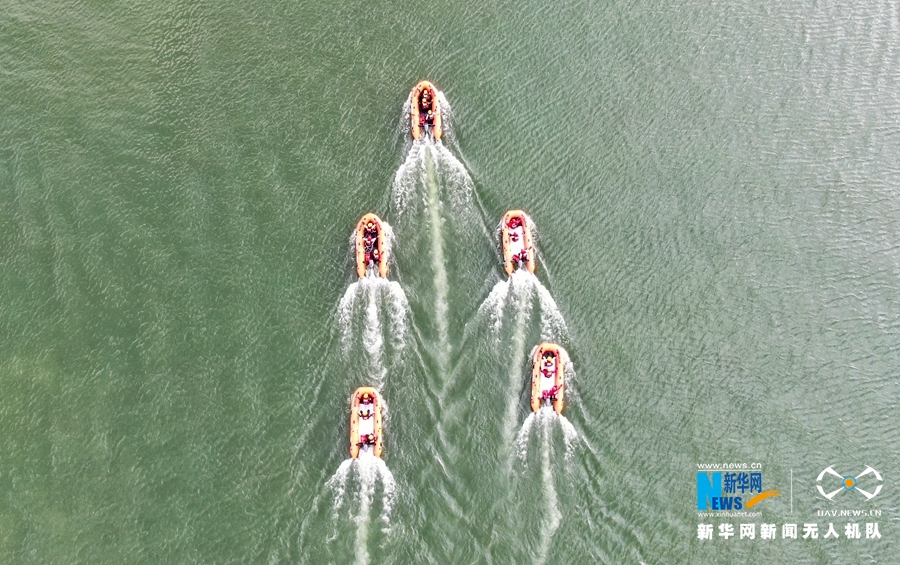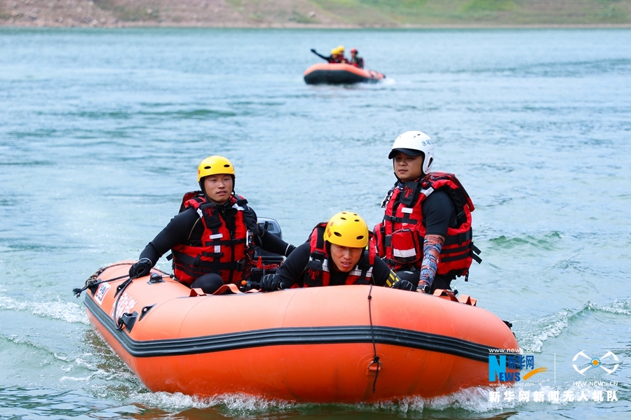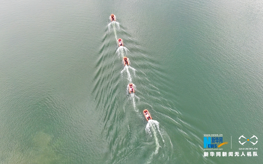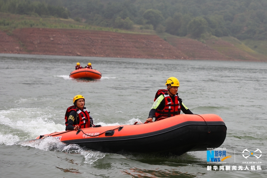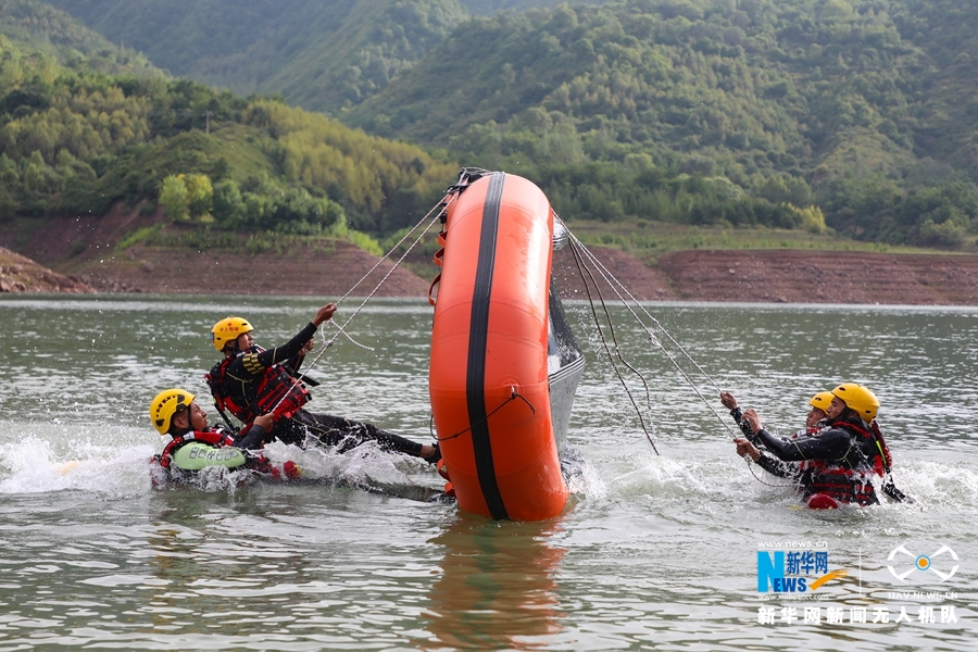 这是近日航拍的甘肃省森林消防总队平凉支队水域救援训练场景。新华网发 (张广魁 摄)